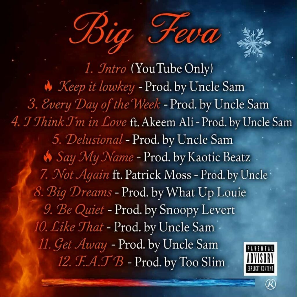 Sonically, “BIG FEVA” is a masterclass in creative balance — bringing together sharp lyricism, cinematic production, and deeply personal storytelling. The project is powered by an elite lineup of producers including Uncle Sam, Snoopy Levert, Too Slim, Kaotic Beatz, and What Up Louie, with the finishing touch handled by the world-renowned iMixNation and Cali Co, ensuring every track hits with precision and polish.